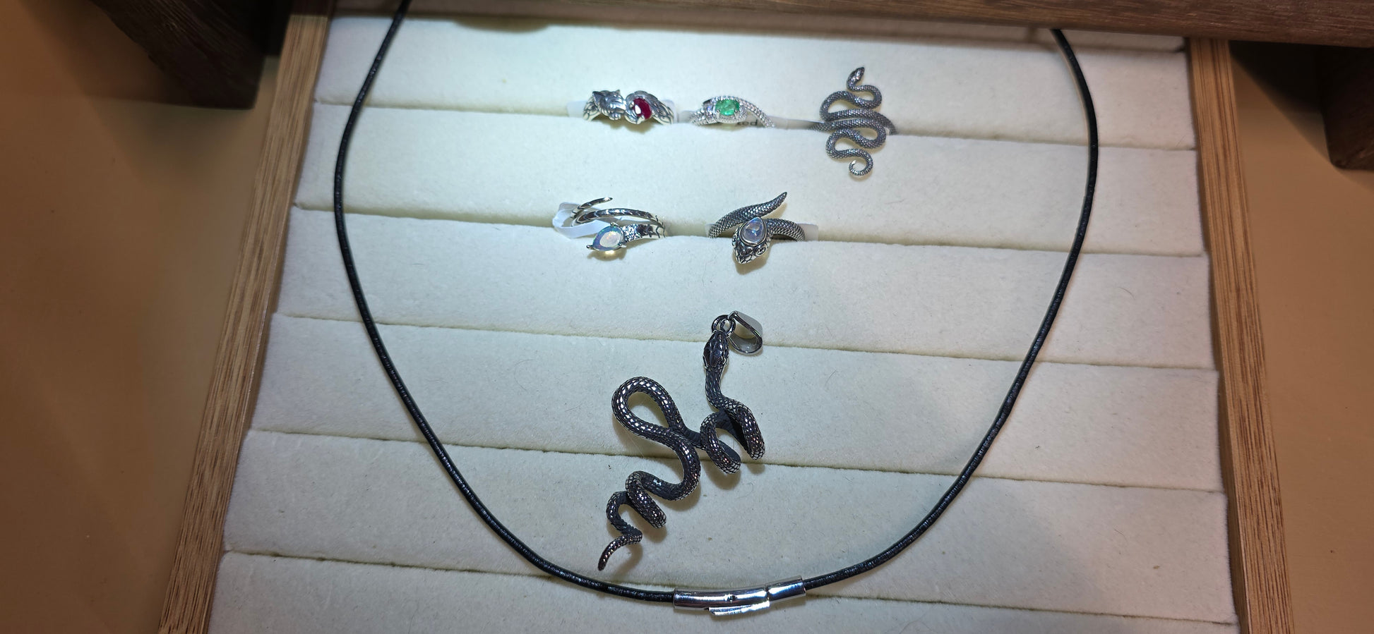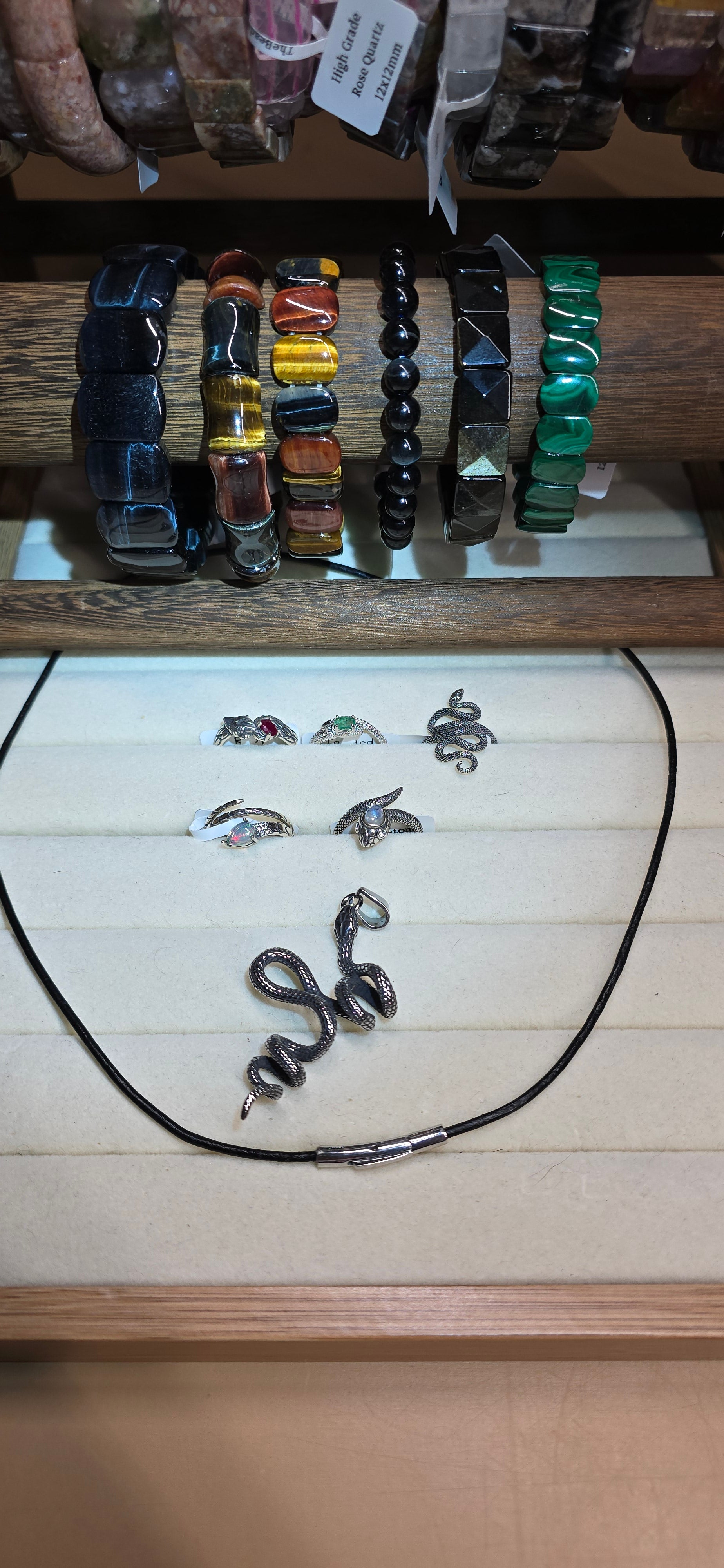 LG square Tiger Eye 15, colorful bamboo Tiger Eye 10, colorful flat Tiger Eye 10, 7mm blue Tiger Eye 10, Golden Obsidian 10, Malachite 15, Ruby Fox Ring 24, Emerald Snake 22, Sterling Snake 50, Opal wrap Snake 22, Moonstone Snake 24, Stainless Steel Snake Pendant w/leather necklace included 20.