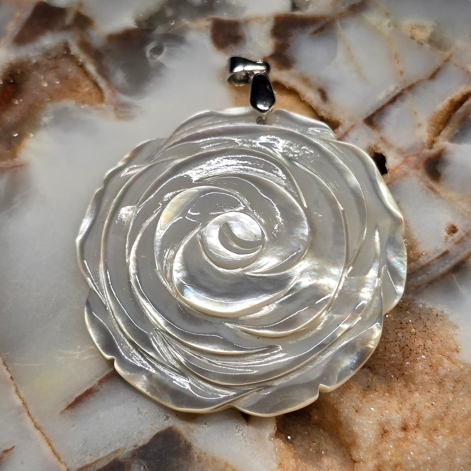 Mother of Pearl Carved Rose Pendant, S925